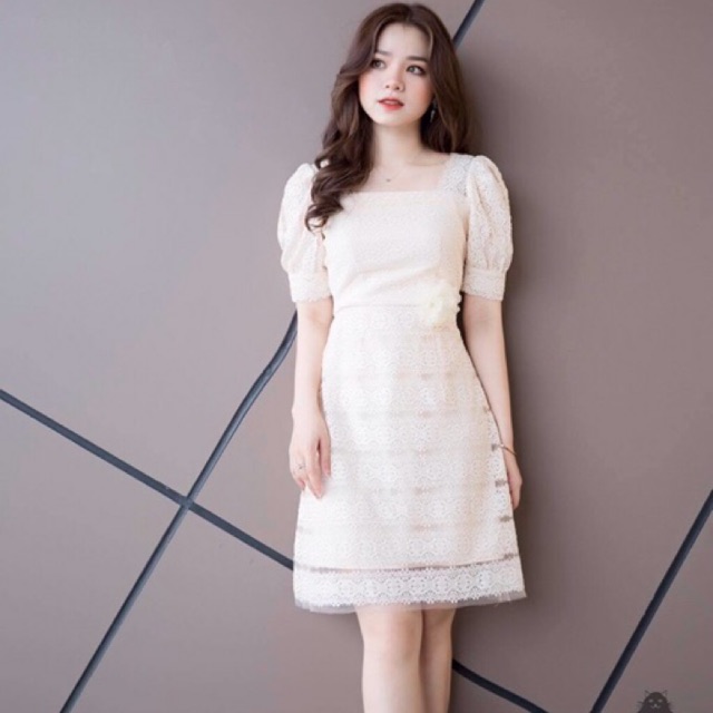 [ MẶC NHƯ SIÊU MẪU] Đầm ren tay bồng cài hoa dáng chữ A chất ren dày dặn, mềm có lớp lót, video và ảnh thật